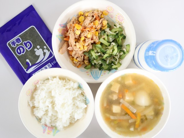 今日の給食は、ご飯、牛乳、手巻きご飯の具、まぐろの甘辛煮、即席和え、のり、吉野汁です。