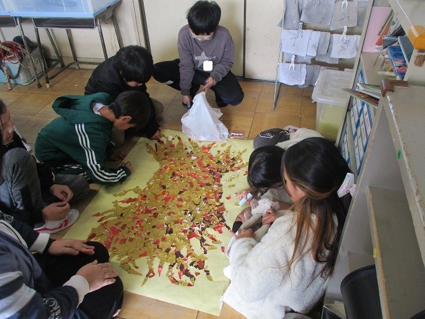 6年生を送る会に向けてメッセージを作成しました。色上質紙を切り抜いた桜の花に6年生への感謝の気持ちなどを書き、クラスの台紙に貼り付けました。