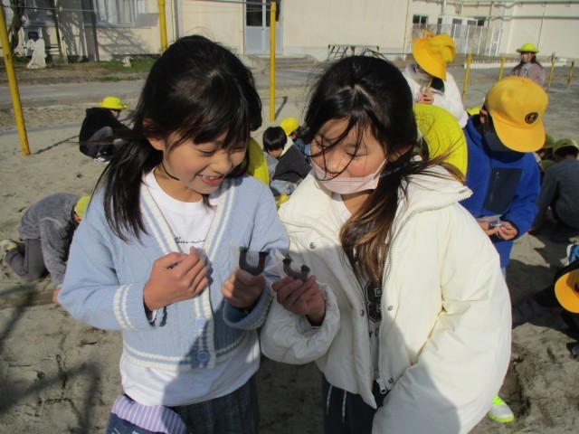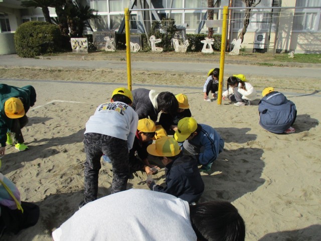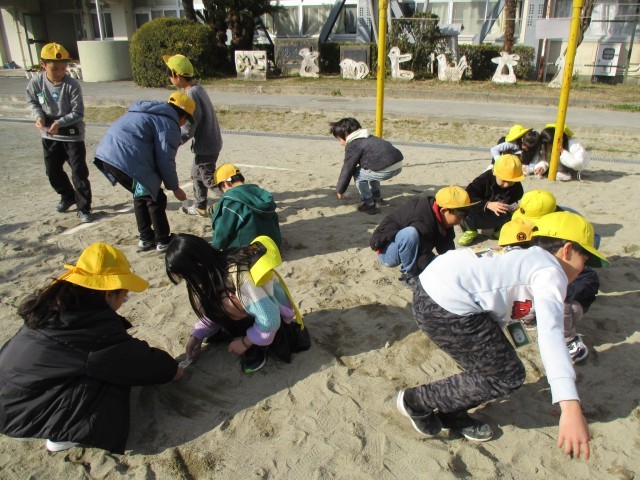 理科の磁石の学習で、砂鉄を集めに砂場へ行きました。