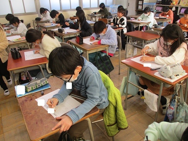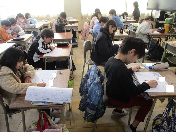1年間に学習した算数の学習内容の振り返りシートに取り組みました。各自が真剣にがんばって、それぞれのペースで進めました。