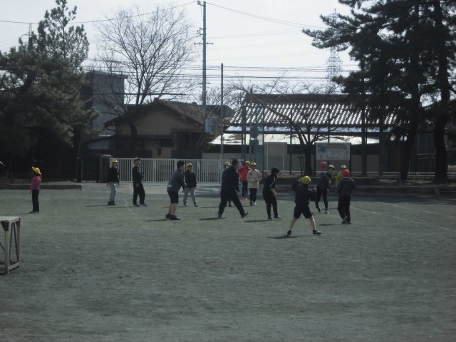もう一枚は、昼放課の様子。先生も参加してドッチボール中です。