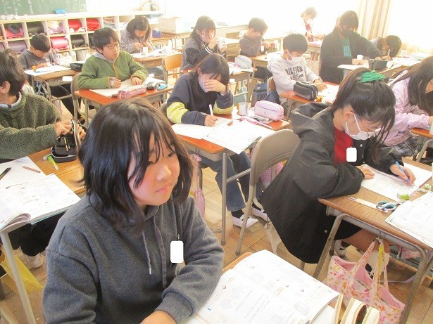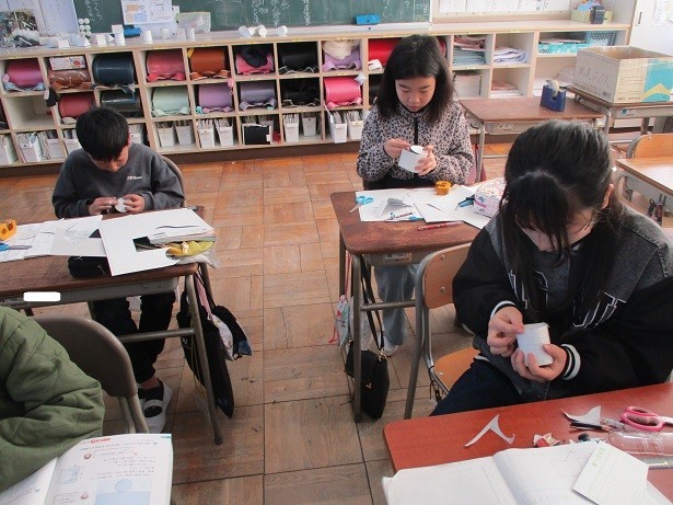 円柱の展開図を描いて組み立てようというめあてで学習しました。側面の横の長さを確認して展開図を描き、円柱を丁寧に作りました。