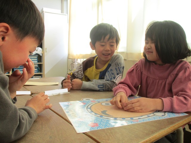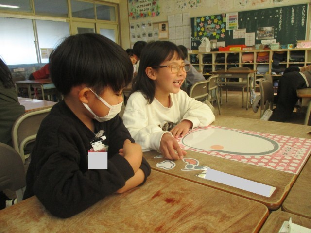 昔遊びの学習で、福笑いにチャレンジしました。初めて遊ぶ児童も多かったようですが、グループの友達と協力して、楽しく取り組むことができました。