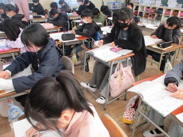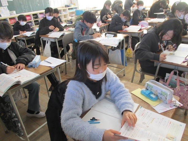 円柱と角柱についての練習問題に取り組もうというめあてで学習しました。単元で学習した内容を振り返りながら真剣に問題を解くことができました。