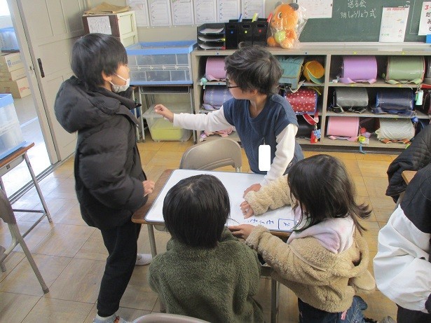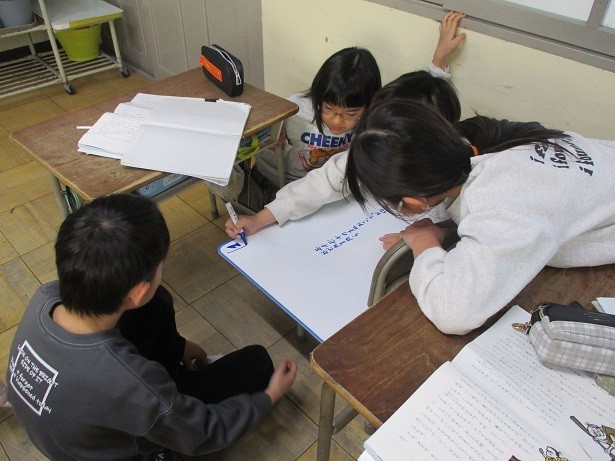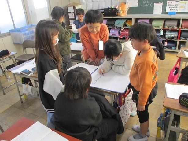 昼の豆太と夜の豆太の違うことは何かを見つけようというめあてで学習しました。グループで話し合ってまとめた内容をホワイトボードに書いてみんなで確認をしました。