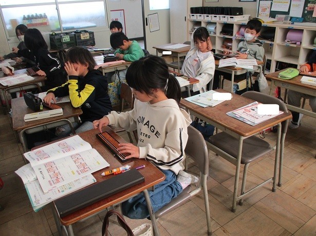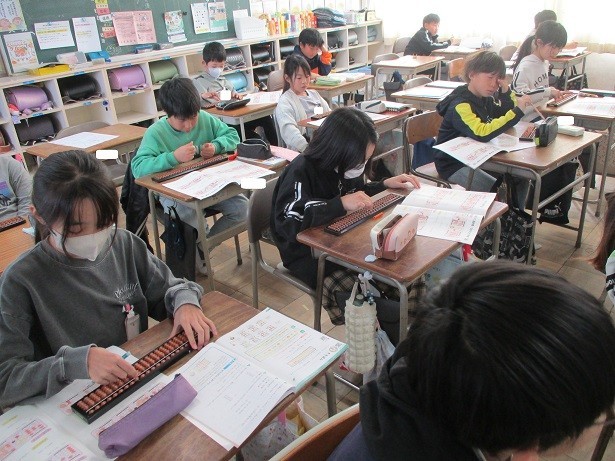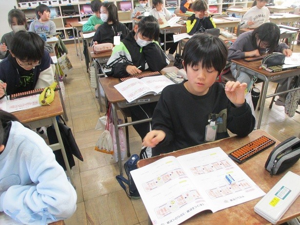 そろばんの使い方を覚えようというめあてで学習しました。親指と人差し指を使って1珠と5珠を動かして使うことを体験しました。