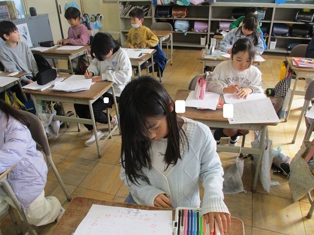 好きなところを伝えようという単元で友達への手紙を2通以上完成させようというめあてで学習しました。下書きを見ながら真剣に書くことができました。