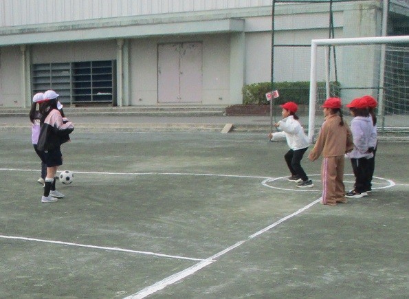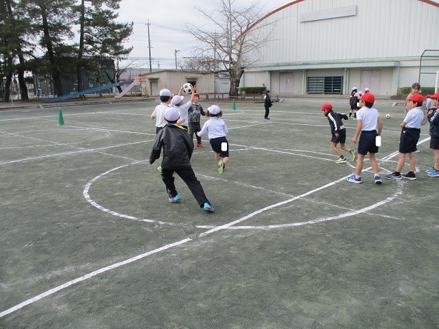 ボールを蹴る練習のために、守備と攻撃に分かれてゲームをしました。守備のメンバーはボールを取った場所に集まり、攻撃側は守備のメンバーが集合する前に目標の場所まで走るというルールで楽しく取り組みました。