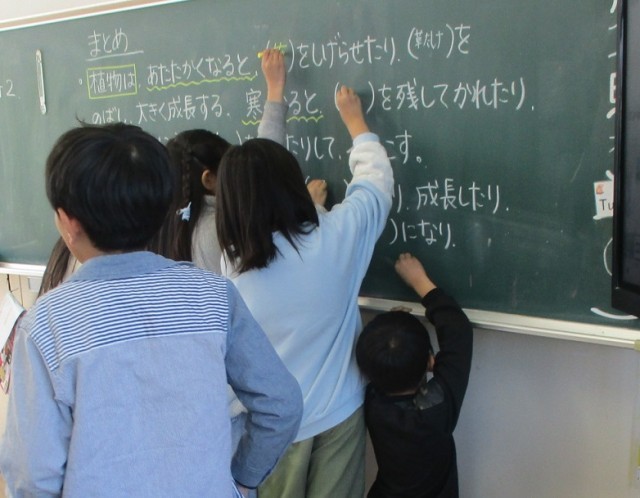 1年間の生き物の学習についてまとめようというめあてで学習しました。植物は温かくなると葉を茂らせ、寒くなると枝を残して葉を落とすなど気温に合わせて活動していることを確認しました。