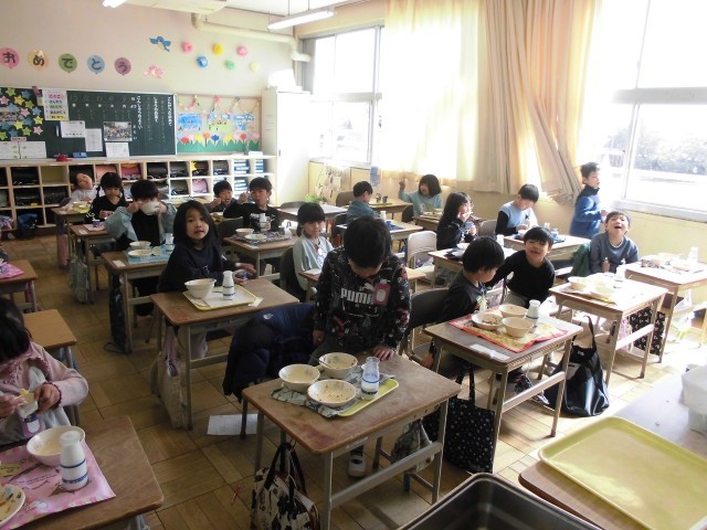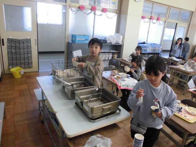 給食の様子です。食事を終わり、席について休んだり、丁寧に片づけを行っていました。