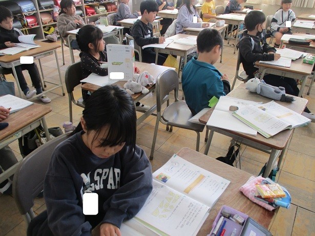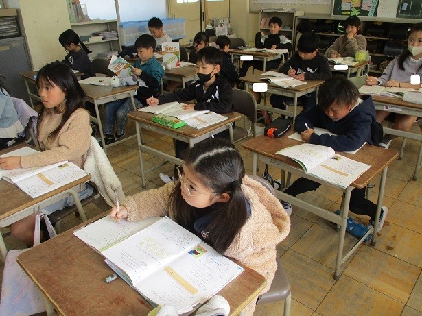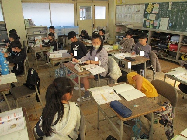 1年間に算数の授業で学習した内容の復習に取り組みました。さっさと問題を解き進められる児童もいて、周りの児童も意欲を喚起されていました。