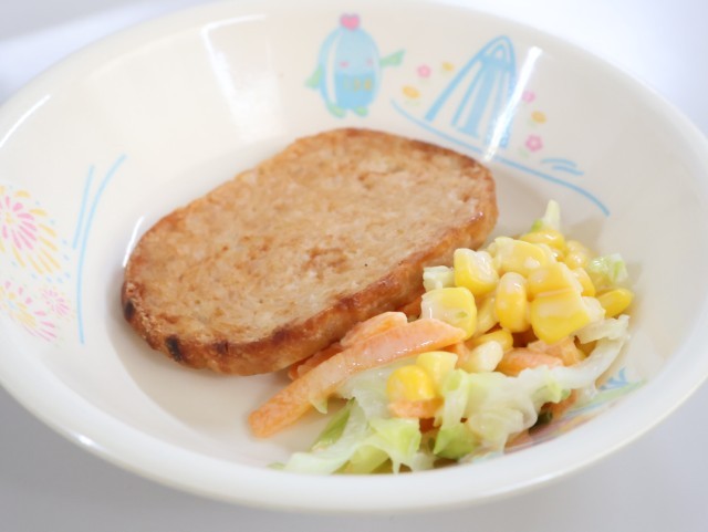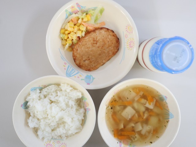今日の給食は、ごはん、牛乳、ボロニアステーキ、春キャベツのサラダ、かぶのコンソメスープです。