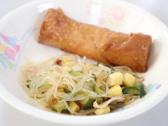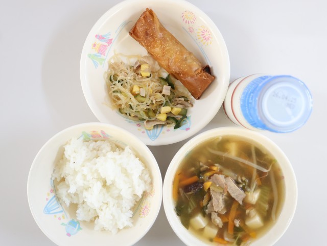 今日の給食は、ごはん、牛乳、春巻、バンサンスー、チンゲンサイと豆腐の中華スープです。