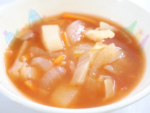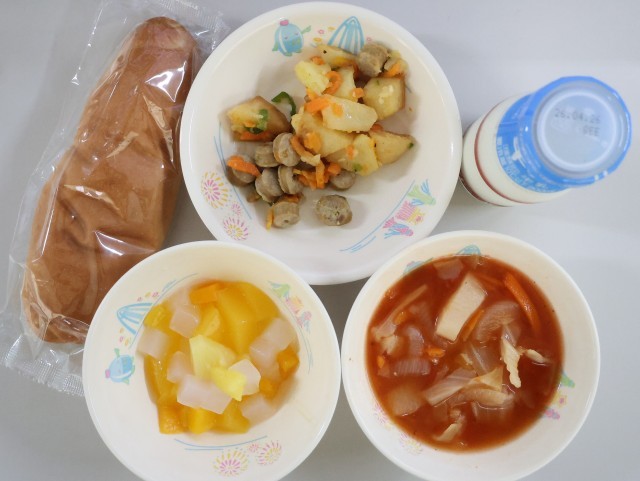 今日の給食は、小麦入り米粉ロールパン、牛乳、じゃがいもとウインナーのコンソメいため、みかんゼリー和え、ミネストローネです。