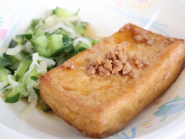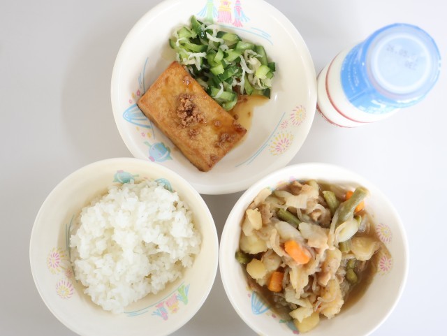 今日の給食は、ご飯、牛乳、厚揚げのそぼろあんかけ、肉じゃが、即席和えです。