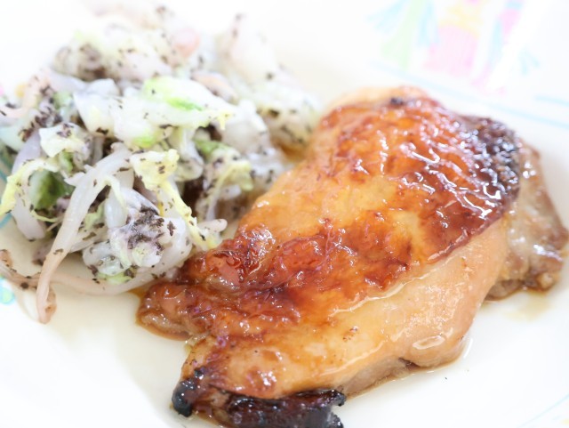 てりどりは給食で人気の料理の一つです。給食のてりどりのおいしさの秘密は、下味と最後にかける甘辛いたれです。まず、とり肉にしょうゆ、酒、しょうがで下味をつけて焼き、しょうゆ、みりん、さとうを煮詰めて作ったたれをかけています。よくかんで味わって食べましょう。