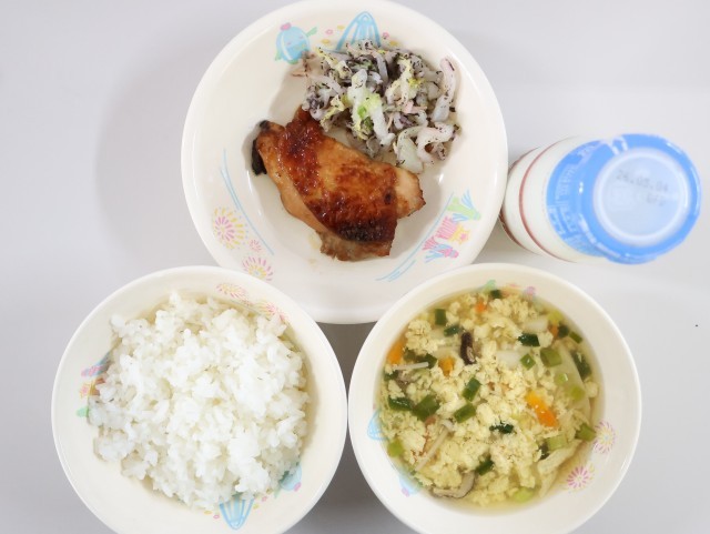 今日の給食は、ご飯、牛乳、てりどり、はくさいの赤じそ和え、かきたま汁です。