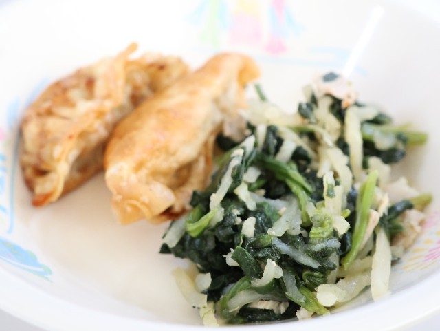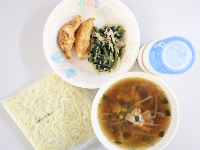 今日の給食は、中華めん、牛乳、しょうゆラーメン(汁)、揚げギョーザ、切干しだいこんの中華和えです。