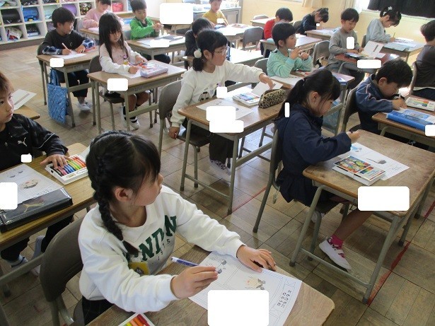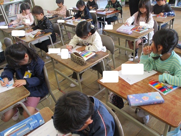 自己紹介カードを作成しました。名前と似顔絵を真剣にかきました。色も丁寧に塗って素敵なカードができました。