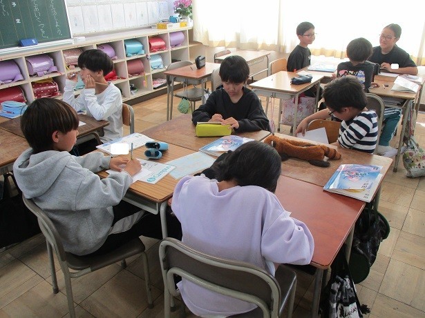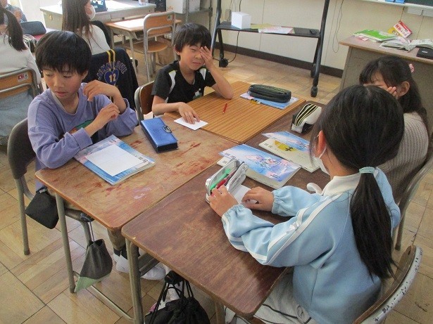 力を合わせてバラバラになるようにしようというめあてで学習しました。アから始まる言葉を紙に書いてグループ全員が書いた言葉が一緒にならないように言葉を考えました。