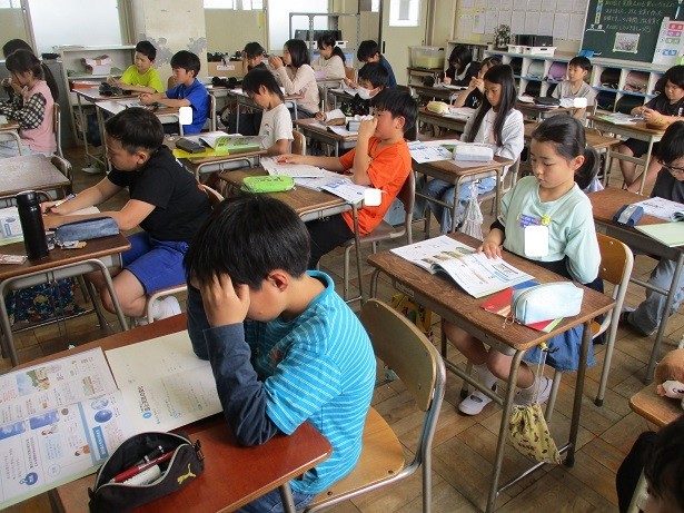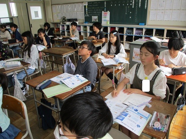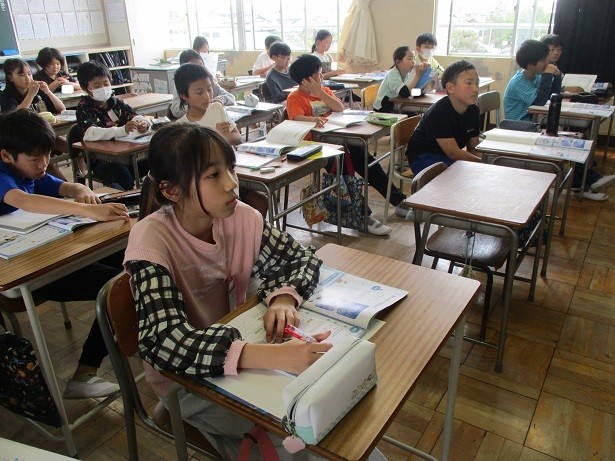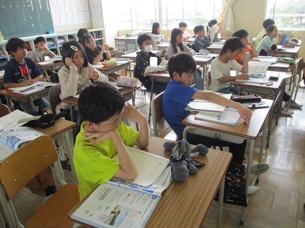 天気が変わるときの雲の様子を観察しようというめあてで学習しました。児童の予想として、雨になる場合はたくさんの黒っぽい雲が早く動いているだろうということになりました。