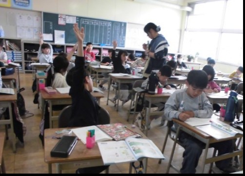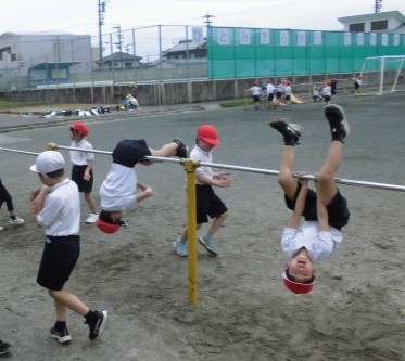 体育では、鉄棒をしていました。地球周りやコウモリおりを見せてくれる児童もいました。