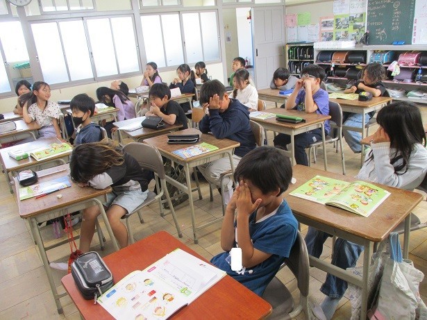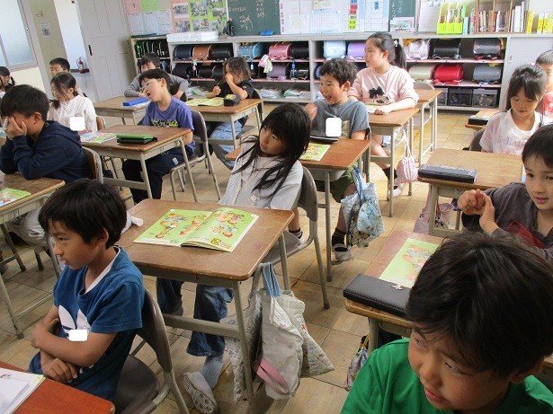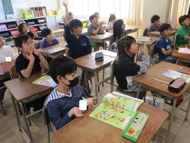 happy、tired、sleepy、hungryなどの単語の発音の練習をしながら、単語の表す状態を動作で表現しました。真剣に表現する姿に感心しました。