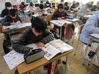 6年生が学活の時間に図書館で司書の先生と一緒に図書館の利用について学び、最後に「味見読書」を行いました。普段読まない本にも目を通し、読書の幅が広がりました。
