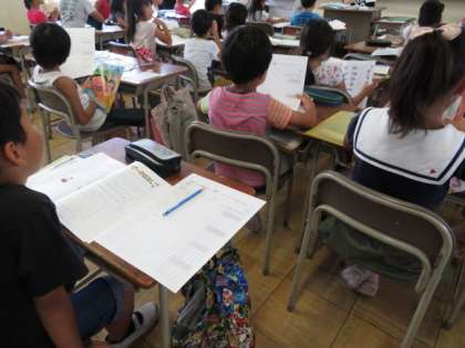 夏休みの日誌やプリントが配付され、宿題の計画を立てています。何に取り組もうかな?楽しそうです。