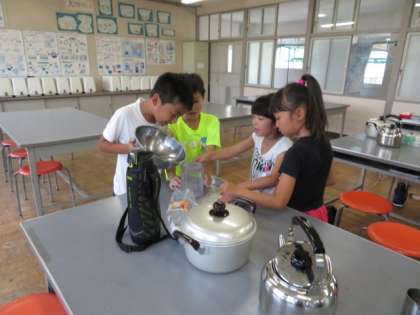 家庭科室で1リットルを実際に量って量を確かめました。グループで順番に体験し、「多いね」「あふれた!」と感想があがっていました。