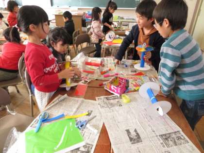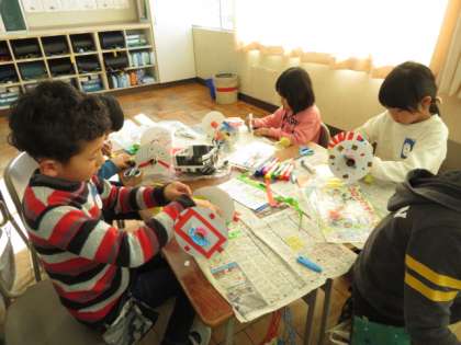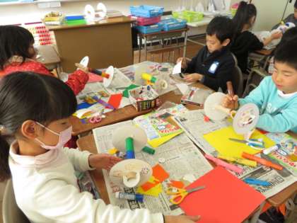 図工で「ころころゆらりん」を作っています。きれいに転がるように工夫して進めています。