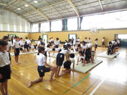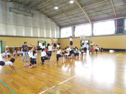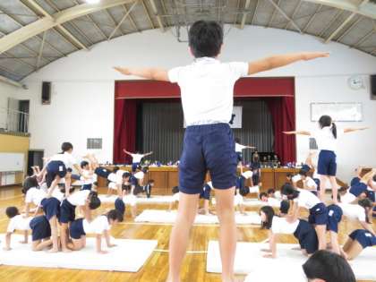 組立体操で技の練習が進み、力を合わせて組むことができるようになりました。皆で声を掛け合って取り組んでいます。
