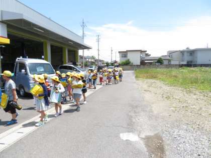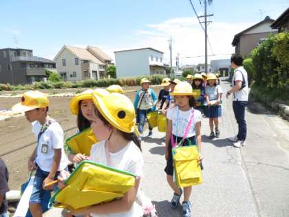 社会で学校周辺の探検をしました。近所の店や田や畑の様子を観察することができました。