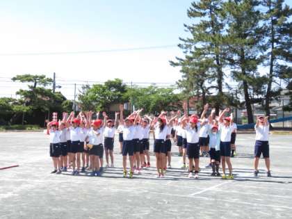 競争遊戯「ぐるぐるダッシュ」の練習です。運動場の練習で皆で力を合わせて行いました。