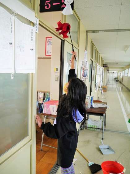 家庭科の授業で教室の大掃除を行いました。水拭きで窓や棚をふいたり、はたきを使って黒板の上やドアの上の日頃見えない埃を落としていました。掃除後の教室はなんだかすっきり!空気も爽やかに感じました。ありがとう!
