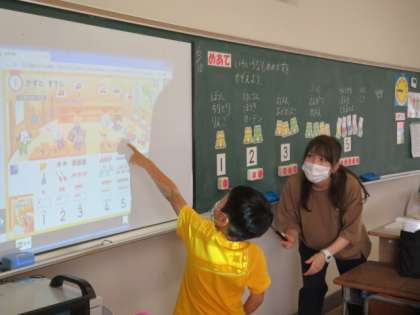 算数の時間です。「いろいろなもののかずをかぞえよう」の学習をしています。ブロックを置いて、ドア・ほうき・つくえ・などの数を数えました。
