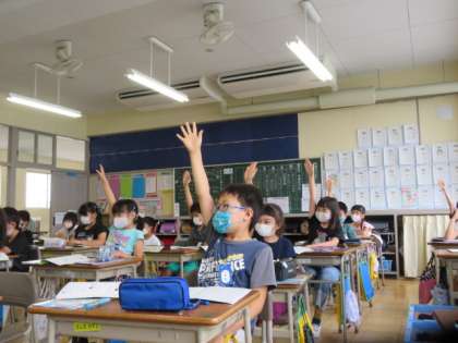 算数で「九九の表を使って」を学習しています。今日はかけ算九九の式の中で隠れている数にどんな数が入るか考えました。表から見つけた後は、決まりをみつけて考えて意見を発表しました。