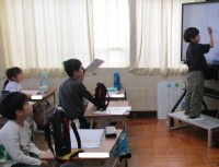 音楽の時間です。「たん と たた のリズムであそぼう」の学習をしています。「たん」と「たた」のリズムを意識しながら、拍にのって「わくわくキッチン」を歌います。