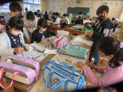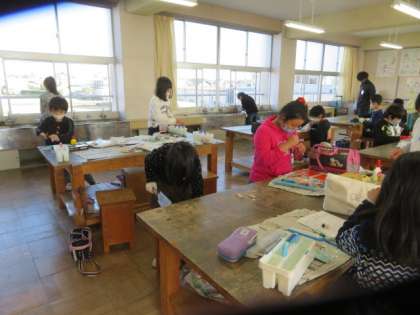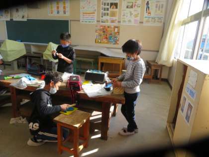 図工で「ギコキコクリエーター」に取り組んでいます。板から自分の作りたいものを設計して工夫しながら作り上げていきます。のこぎりで切った後は彩色しながら組み立てています。