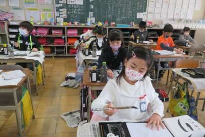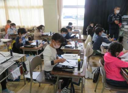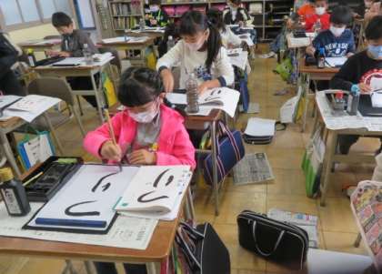 書写の時間です。「つり」という字をめあてにそって書いています。まがりのむきに注意して書きました。