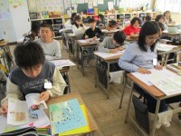 英語の時間です。ALTと一緒にほしいフル−ツや野菜の名前と数を答える練習していきます。