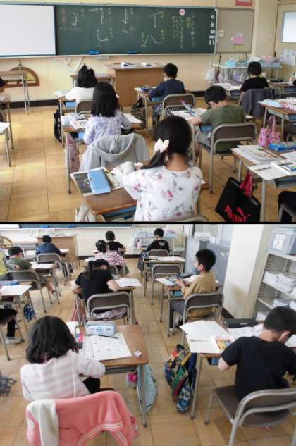 書写の時間は、フェルトペンを用いて、いろいろな書き方の練習です。「とめ」「はね」「おれ」「まがり」「はらい」など、丁寧にしっかりと書けましたね。