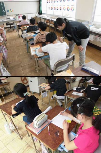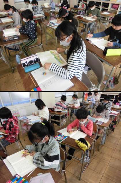 国語は、「白いぼうし」の本文から、読みたくなる表現の工夫を探して、黄色い線を引きます。素敵な表現だなというにおいを感じて探しています。
