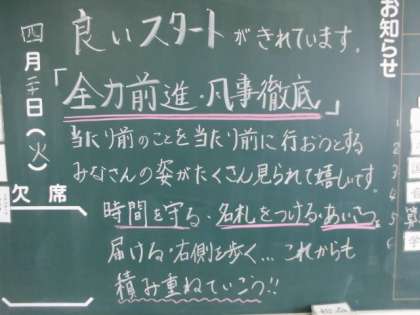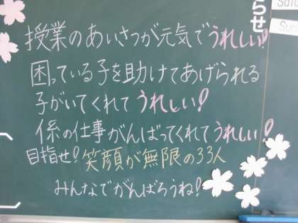 昨日に引き続いて、温かい担任メッセージを紹介します。4月も来週で終わりです。新しい学級が、より良い学級になるよう、より良い仲間の集まりになるよう、一人一人の力で頑張っていきましょう。☆輝け はばたけ 西成っ子☆だよ。
