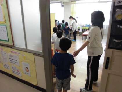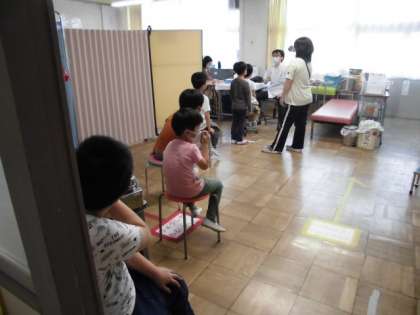昨日の耳鼻科検診に続いて、今日は眼科検診が行われました。1年生の児童は、昨日の今日で慣れた様子で、保健室前に整列をして検診に臨んでいます。きちんと自分の順番を待つ姿もできていますね。明日も続いて、心電図検査が行われますから、しっかりね。