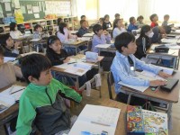 社会科は、「デレーケの行った工事をまとめよう」です。読み物資料を参考に、先生の説明に基づいて、ノートに書き込んでいきます。校外学習で行った木曽三川公園を思い出したかな。