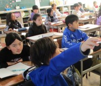 体育は、2学級合同で、屋内運動場で体力テストを行いました。反復横跳びと長座体前屈です。反復横跳びは、20秒間で何回できるか数えます。また、長座体前屈は、体の柔軟性を測定します。さすが、体が柔らかいですね。