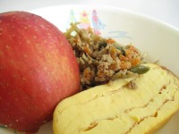 今日の献立は、ごはん、牛乳、コンソメスープ、ハンバーグの彩りソースがけです。