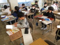 たぬきの糸車の音読をしました。いつ、どこで、だれがに気をつけて指で教科書の文字を...