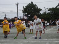 運動会で行う競争遊戯の練習をしました。2人で大きなパンツに入って走り、パンツがバ...